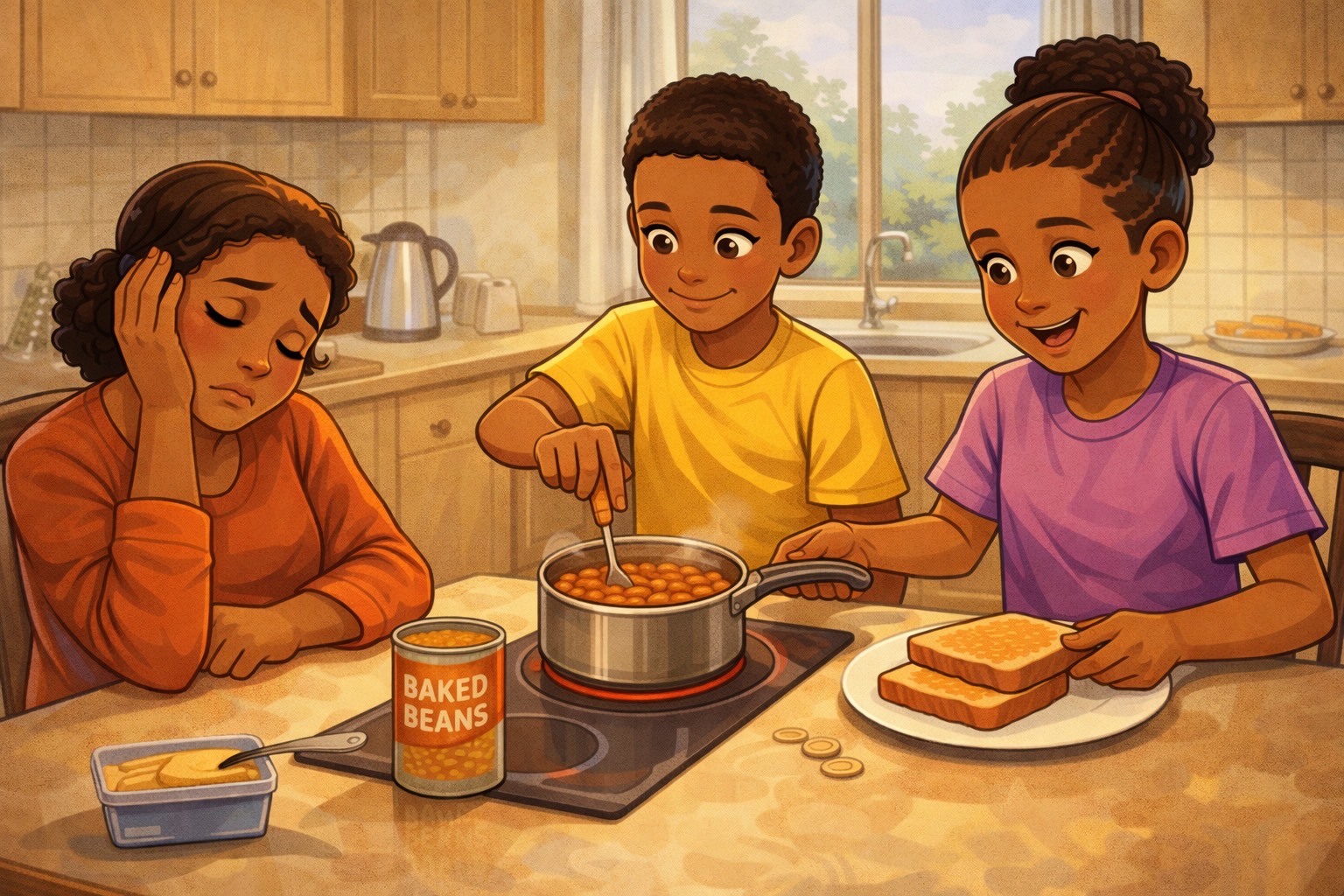 A parent is feeling unwell and does not feel able to prepare lunch. Their ten-year-old twins say they are hungry and ask if they can make their own lunch. The parent suggests sandwiches, but the children ask whether they can have beans on toast instead.
